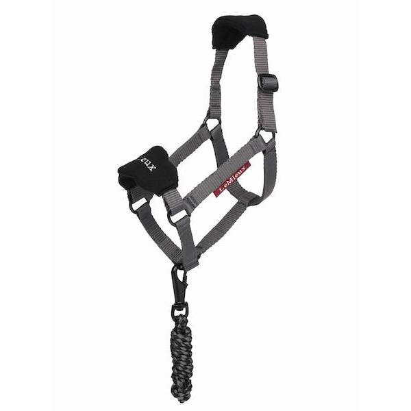Den fineste lille LeMieux Vogue grime i grå nylon med sort fleece over nakke og næseryg.