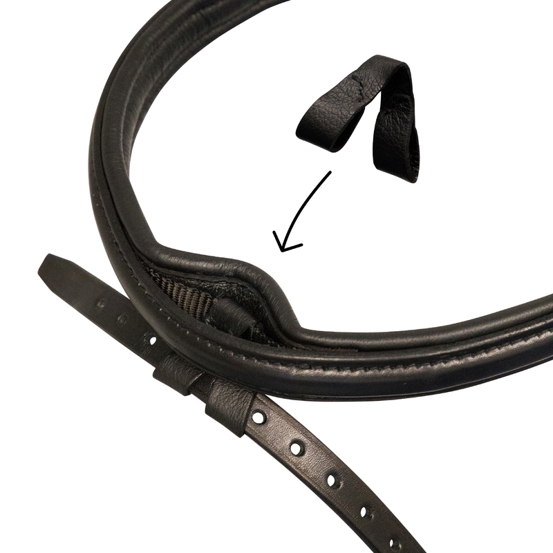 Det polstrede næsebåndet er bredt på midten, og smalt på siderne. Det giver ekstra plads, så bidet ikke kommer til at klemme imod næsebåndet.