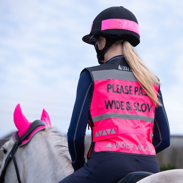 Flot og synlig refleksvest med teksten "Please Pass Wide & Slow" på ryggen. ("Venligst passer, langsomt og med afstand")